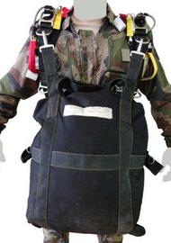 Evaluée par la STAT en 2011, cette gaine filet, fabriquée par la société PARATEC, a été choisie à l’origine pour les commandos du 13ème RDP dont les sacs, volumineux et lourds, n’étaient pas compatibles avec les gaines en service à l’époque. La gaine SG7 nue pèse 5,8 kg et permet l’emport d’une charge jusqu’à 115 kg. Elle est composée d’un tablier, de sangles et d’un système de délestage. Elle dispose de 2 sangles cuissardes et de 4 points d’accrochage au harnais du parachute. Le système de délestage est composé d’une corde d’escalade de 6 m de long et de Ø 8,5 mm, réglable en dimension et pourvu d’une libération d’urgence. La durée de vie de la gaine est de 20 ans. |